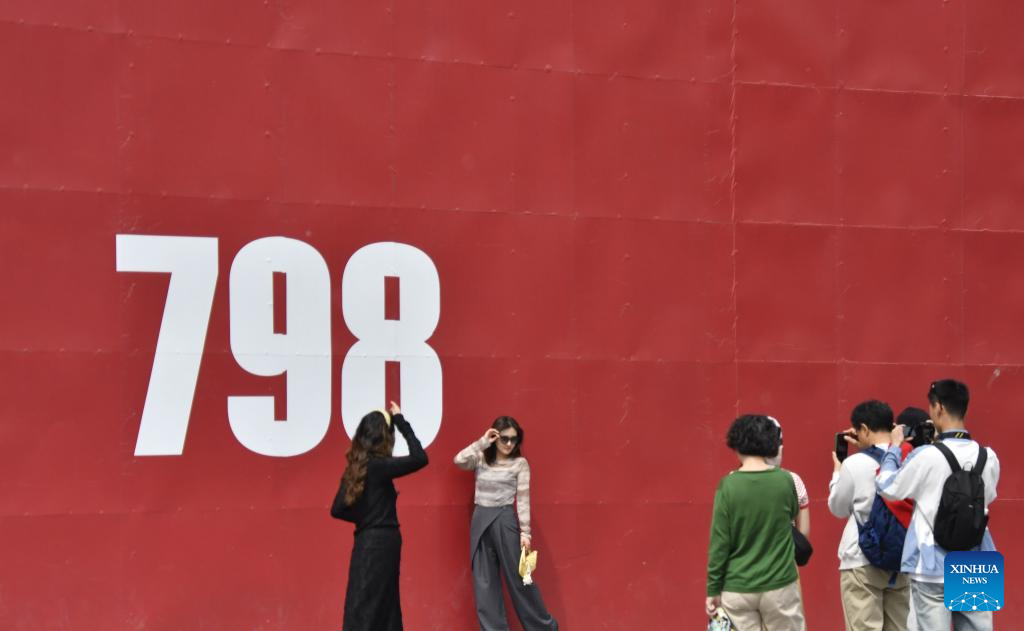 (250504) -- BEIJING, May 4, 2025 (Xinhua) -- People pose for a photo at the 798 art zone in Beijing, capital of China, May 4, 2025. People across China enjoy the ongoing May Day holiday in various ways. (Xinhua/Li Xin)
