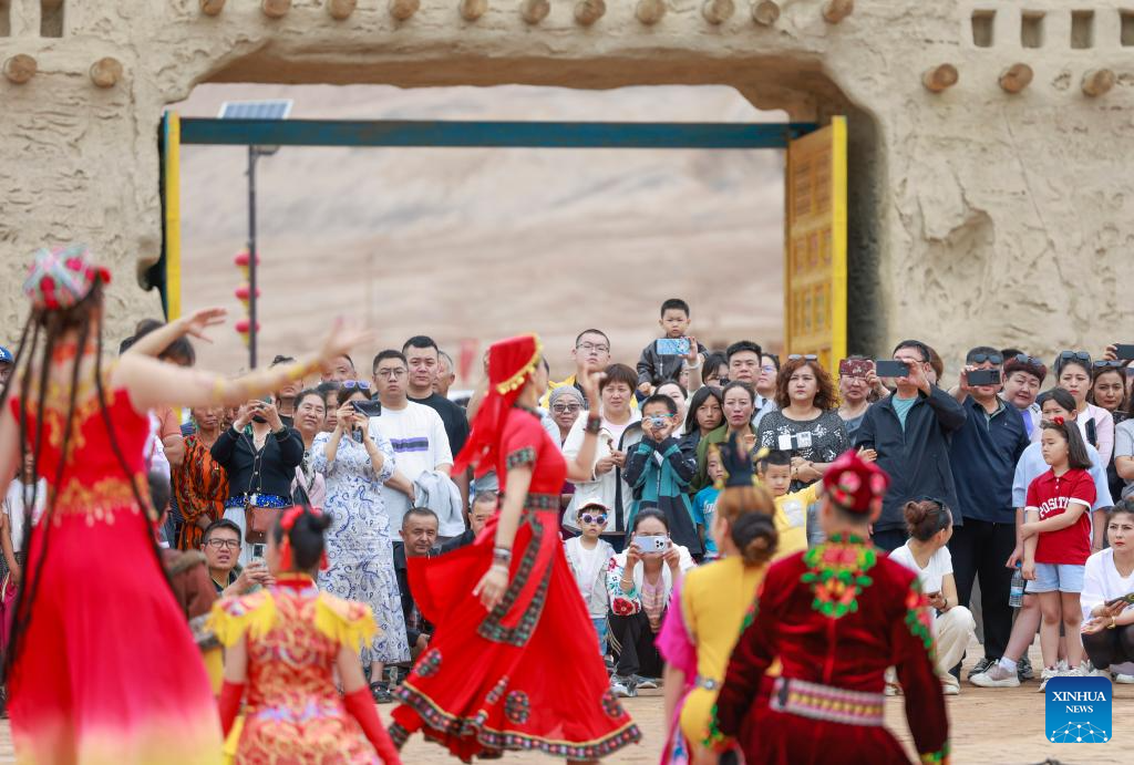 (250504) -- TURPAN, May 4, 2025 (Xinhua) -- Tourists watch a folk art performance at a scenic area in Turpan, northwest China's Xinjiang Uygur Autonomous Region, May 4, 2025. People across China enjoy the ongoing May Day holiday in various ways. (Xinhua/Wang Fei)