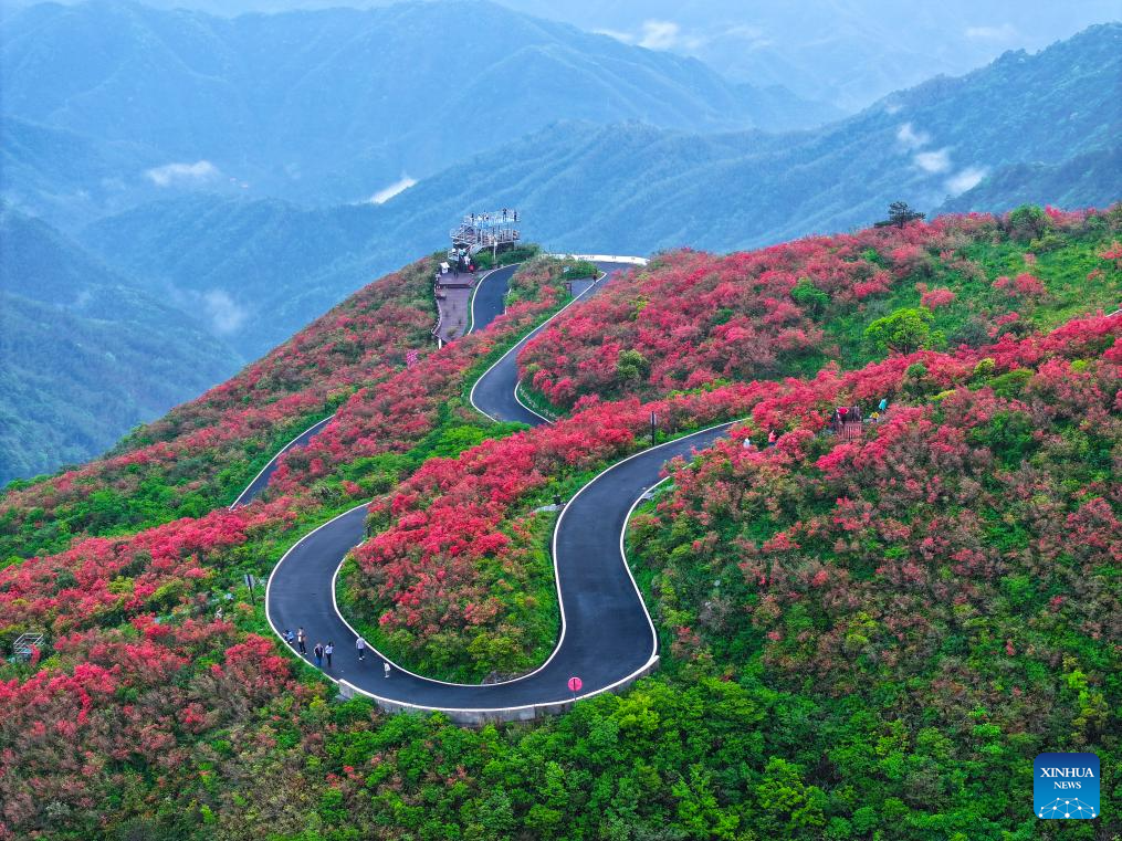 (250504) -- YONGZHOU, May 4, 2025 (Xinhua) -- An aerial drone photo taken on May 3, 2025 shows tourists viewing azalea flowers in Yongzhou, central China's Hunan Province. People across China enjoy the ongoing May Day holiday in various ways. (Photo by Zhou Xiuyuchun/Xinhua)