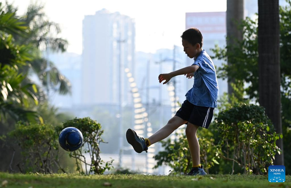 (250504) -- NANNING, May 4, 2025 (Xinhua) -- A child plays football by the Nanhu lake in Nanning, south China's Guangxi Zhuang Autonomous Region, May 2, 2025. People across China enjoy the ongoing May Day holiday in various ways. (Xinhua/Lu Boan)