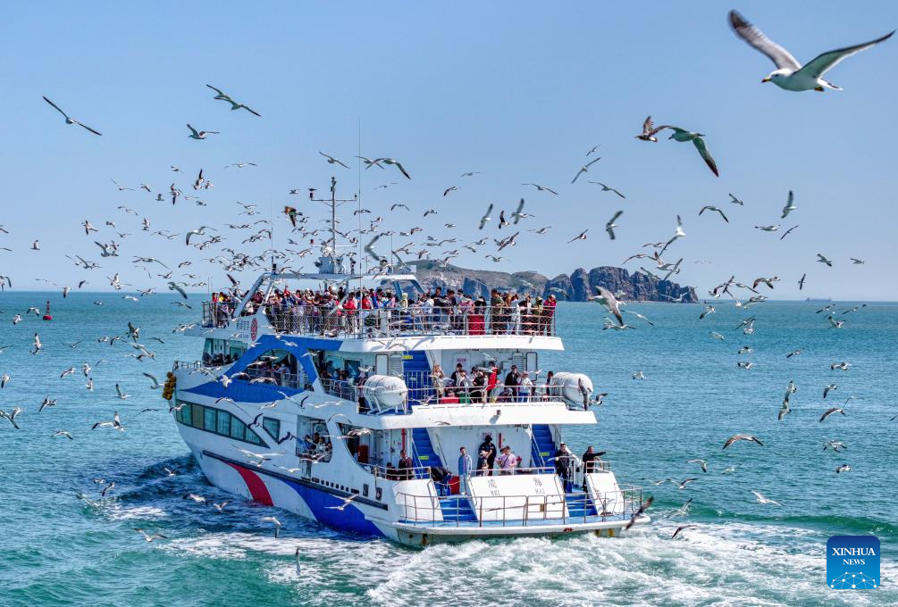 (250504) -- RONGCHENG, May 4, 2025 (Xinhua) -- This aerial drone photo taken on May 4, 2025 shows tourists enjoy a boat tour in Rongcheng City, east China's Shandong Province. People across China enjoy the ongoing May Day holiday in various ways. (Photo by Li Xinjun/Xinhua)