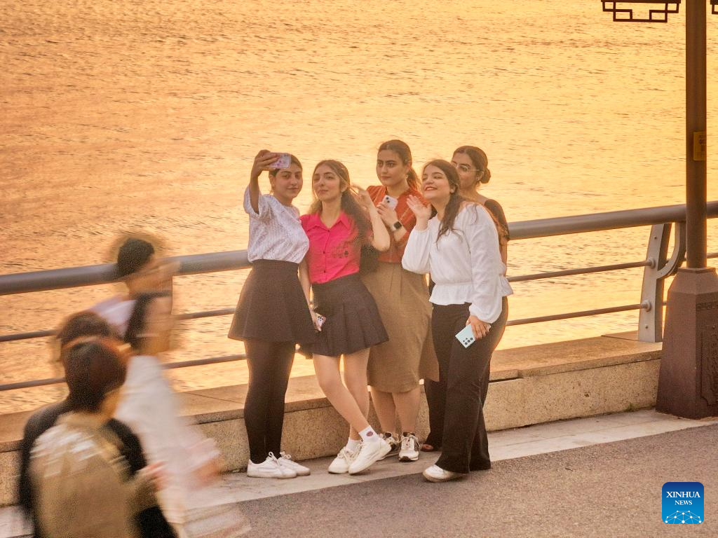 (250504) -- NANTONG, May 4, 2025 (Xinhua) -- Tourists take a selfie by the lakeside in Nantong City, east China's Jiangsu Province, May 3, 2025. People across China enjoy the ongoing May Day holiday in various ways. (Photo by Xu Congjun/Xinhua)