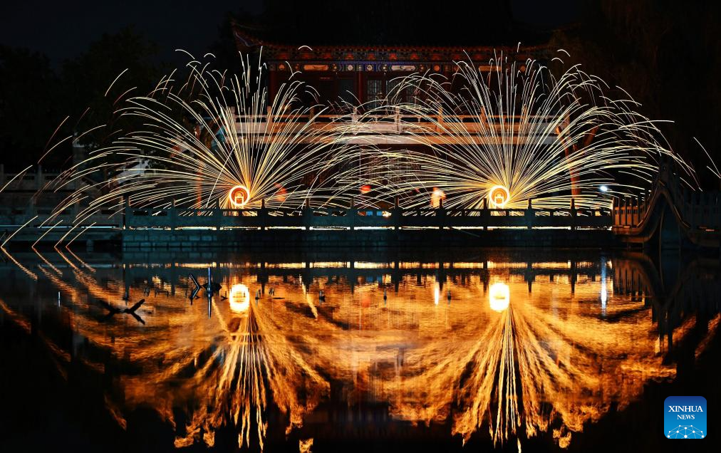 (250504) -- TENGZHOU, May 4, 2025 (Xinhua) -- Folk artists perform a molten iron fireworks show in Tengzhong, east China's Shandong Province, May 3, 2025. People across China enjoy the ongoing May Day holiday in various ways. (Photo by Li Zhijun/Xinhua)