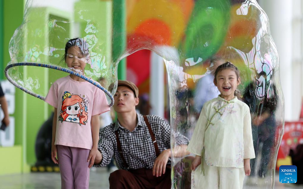 (250504) -- TANCHENG, May 4, 2025 (Xinhua) -- Children enjoy a bubble show in Tancheng County, Linyi City, east China's Shandong Province, May 4, 2025. People across China enjoy the ongoing May Day holiday in various ways. (Photo by Zhang Chunlei/Xinhua)