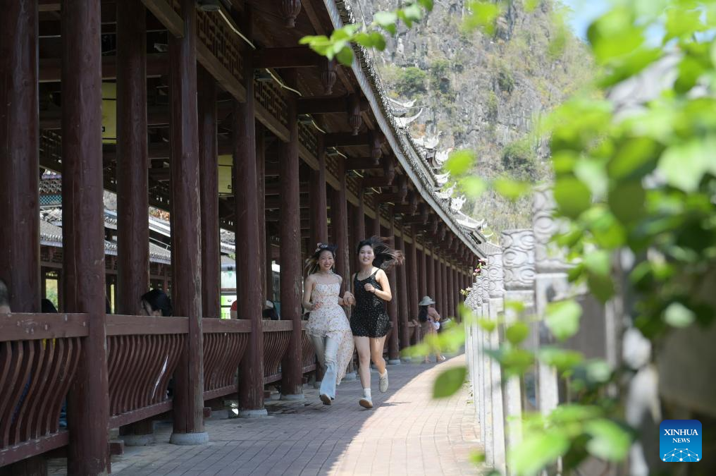 (250504) -- BAISE, May 4, 2025 (Xinhua) -- Tourists enjoy themselves at a scenic spot in Baise, south China's Guangxi Zhuang Autonomous Region, May 3, 2025. People across China enjoy the ongoing May Day holiday in various ways. (Photo by Miao Yucai/Xinhua)