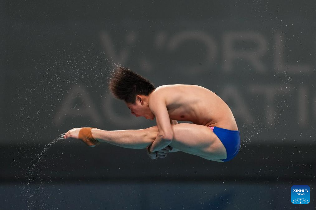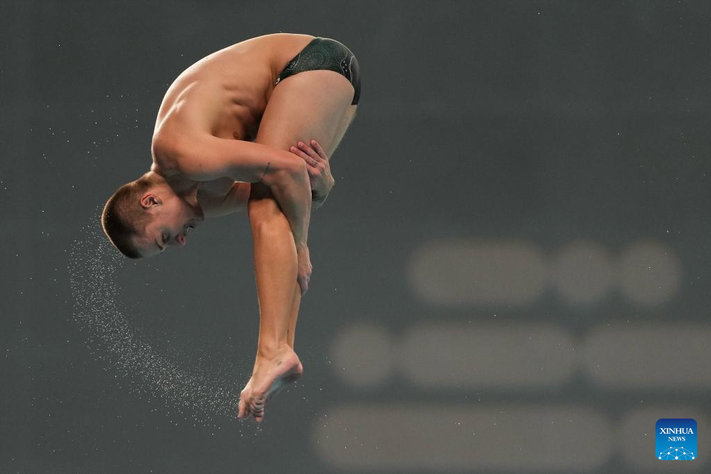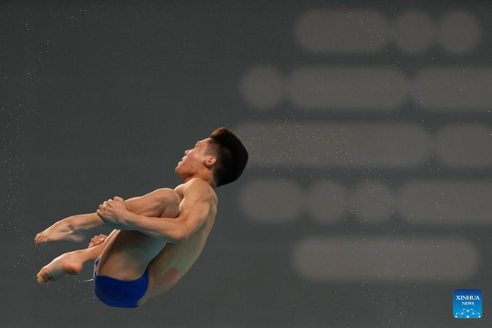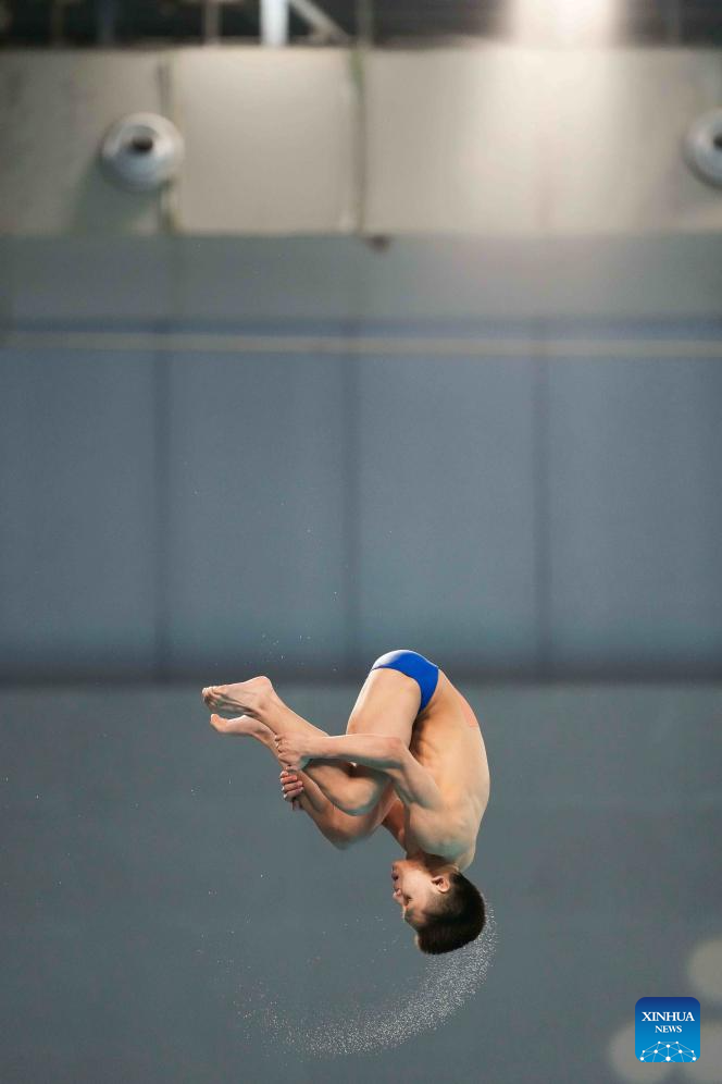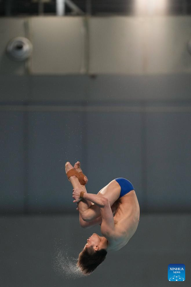 Cheng Zilong of China competes during the men's 10m platform final at the World Aquatics Diving World Cup 2025 Super Final in Beijing, capital of China, May 4, 2025. (Photo by Na Yuqi/Xinhua)