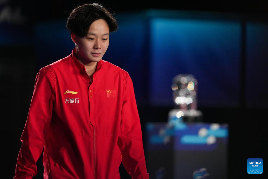 Chen Yiwen of China walks by the trophy before the women's 3m springboard final at the World Aquatics Diving World Cup 2025 Super Final in Beijing, capital of China, May 4, 2025. (Photo by Na Yuqi/Xinhua)