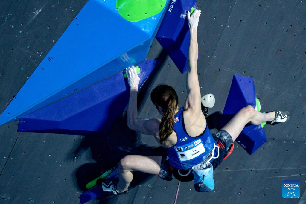 Erin McNeice of Great Britain competes during the women's lead final at the IFSC Climbing World Cup Bali 2025 in Bali, Indonesia, May 4, 2025. (Photo by Dicky Bisinglasi/Xinhua)