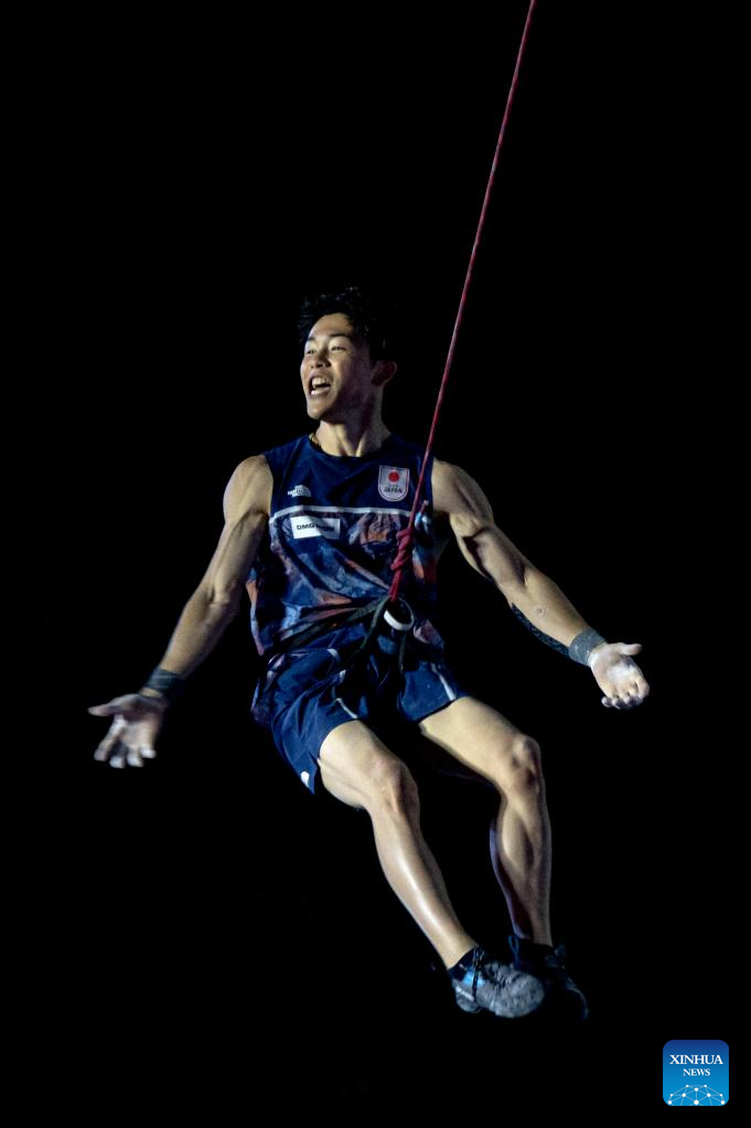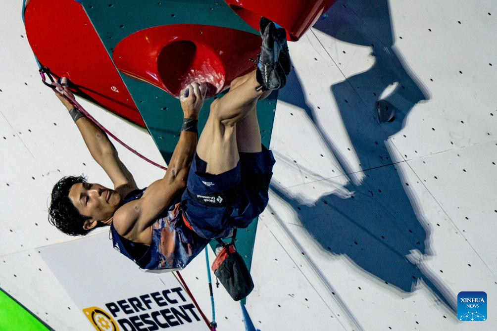 Yoshida Satone of Japan competes during the men's lead final at the IFSC Climbing World Cup Bali 2025 in Bali, Indonesia, May 4, 2025. (Photo by Dicky Bisinglasi/Xinhua)