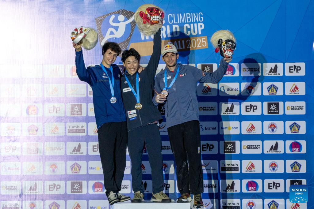 Gold medalist Yoshida Satone (C) of Japan, silver medalist Max Bertone (L) of France and bronze medalist Alberto Gines Lopez of Spain pose during the awarding ceremony of the men's lead final at the IFSC Climbing World Cup Bali 2025 in Bali, Indonesia, May 4, 2025. (Photo by Dicky Bisinglasi/Xinhua)