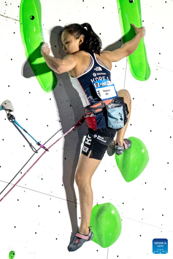 Seo Chaehyun of South Korea competes during the women's lead final at the IFSC Climbing World Cup Bali 2025 in Bali, Indonesia, May 4, 2025. (Photo by Dicky Bisinglasi/Xinhua)