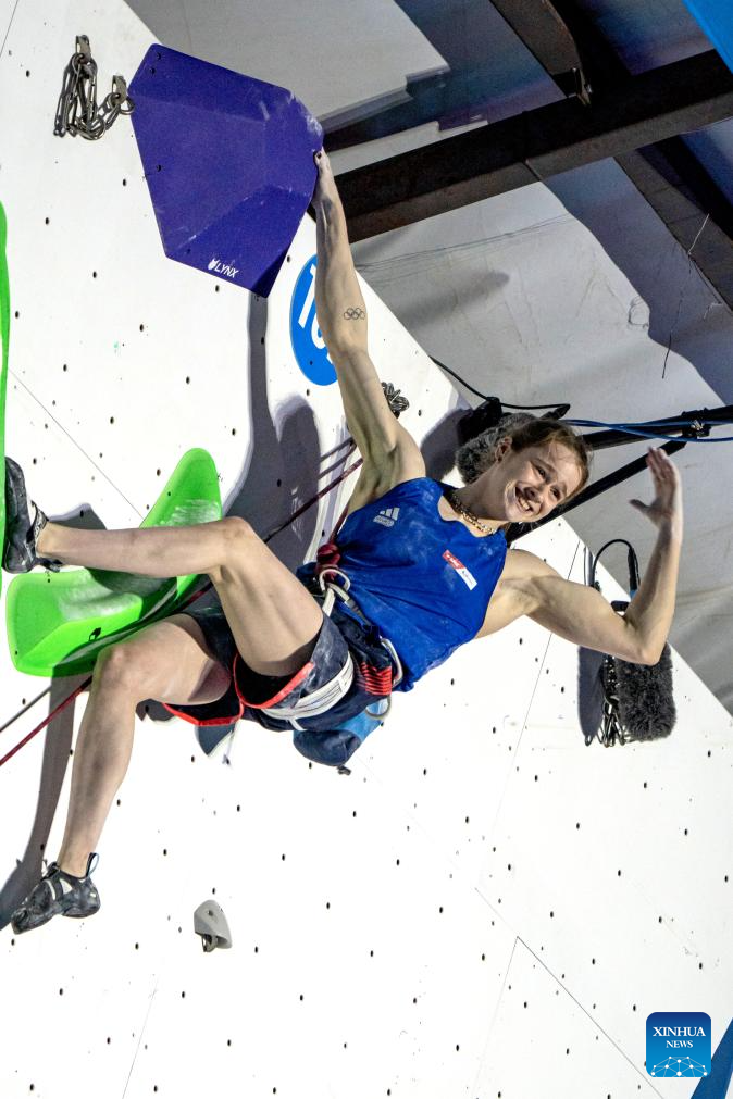 Erin McNeice of Great Britain reacts after winning the women's lead gold medal race of the women's lead final at the IFSC Climbing World Cup Bali 2025 in Bali, Indonesia, May 4, 2025. (Photo by Dicky Bisinglasi/Xinhua)