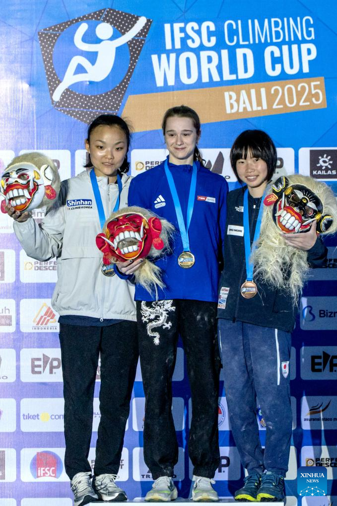 Gold medalist Erin McNeice (C) of Great Britain, silver medalist Seo Chaehyun (L) of South Korea and bronze medalist Mori Ai of Japan pose during the awarding ceremony of the women's lead final at the IFSC Climbing World Cup Bali 2025 in Bali, Indonesia, May 4, 2025. (Photo by Dicky Bisinglasi/Xinhua)