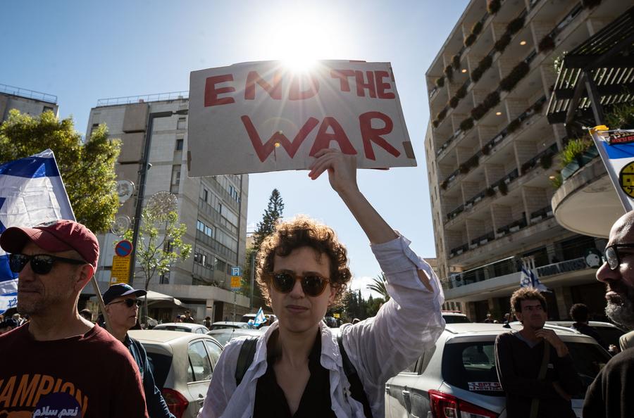 People attend a rally near the Israeli Prime Minister's Office in Jerusalem, March 19, 2025. A mass rally broke out in Jerusalem on Wednesday, protesting against Israel's resumption of military operations in Gaza and calling for an immediate ceasefire and the release of hostages. (Xinhua/Chen Junqing)