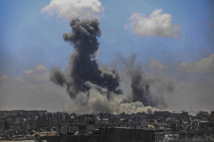 Smoke rises following an Israeli airstrike in Gaza City, on April 25, 2025. (Photo by Mahmoud Zaki/Xinhua)
