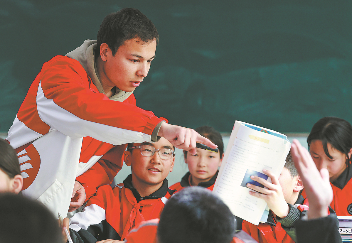 A teaching volunteer instructs students at a village primary school in Kizilsu Kirgiz autonomous prefecture, Xinjiang Uygur autonomous region, on April 23. The volunteer teaching program that began here in 2022 has helped improve academic performance of local students over the past three years. (Wang Fei/Xinhua)