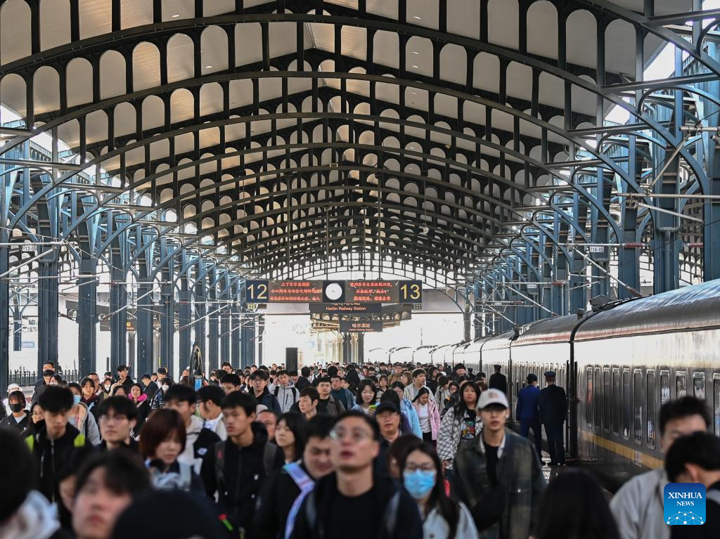 Passengers disembark at Harbin Railway Station in Harbin, northeast China's Heilongjiang Province, May 5, 2025. On the last day of the May Day holiday, a peak in return trips was observed nationwide. (Photo by Yuan Yong/Xinhua)