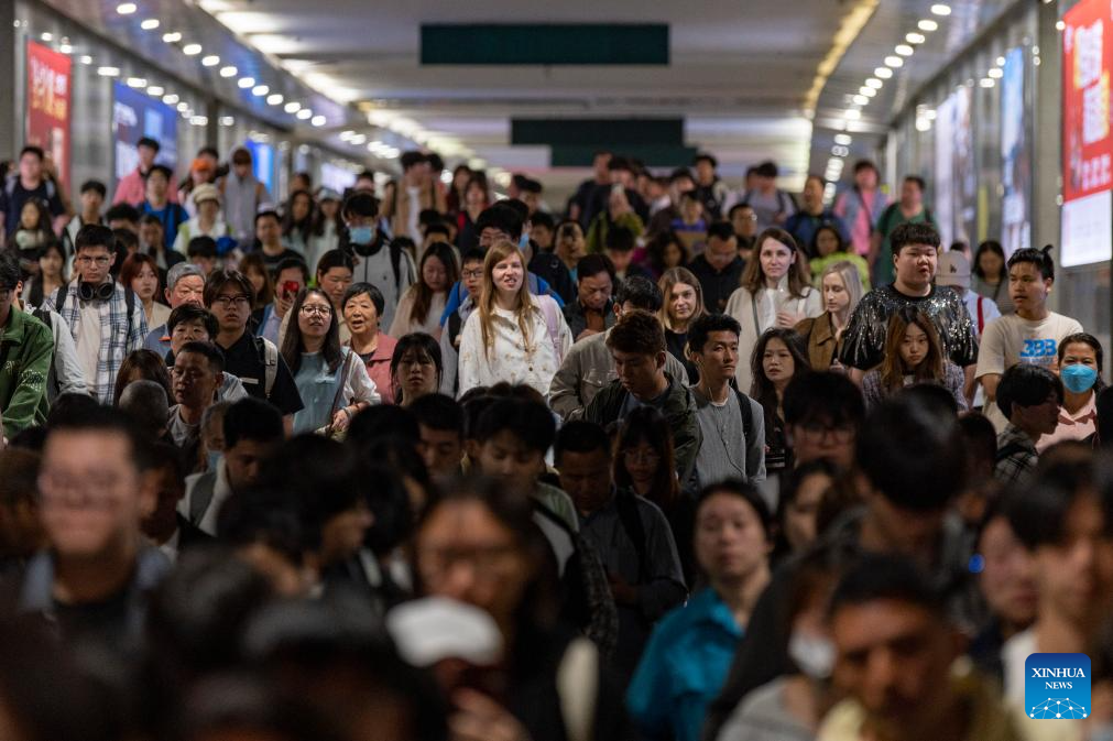 Passengers disembark at Jinhua Railway Station in Jinhua, east China's Zhejiang Province, May 5, 2025. On the last day of the May Day holiday, a peak in return trips was observed nationwide. (Photo by Hu Xiaofei/Xinhua)
