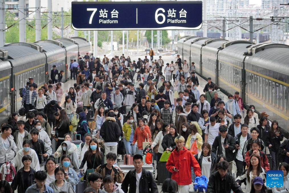 Passengers disembark at Yantai Railway Station in Yantai, east China's Shandong Province, May 5, 2025. On the last day of the May Day holiday, a peak in return trips was observed nationwide. (Photo by Tang Ke/Xinhua)
