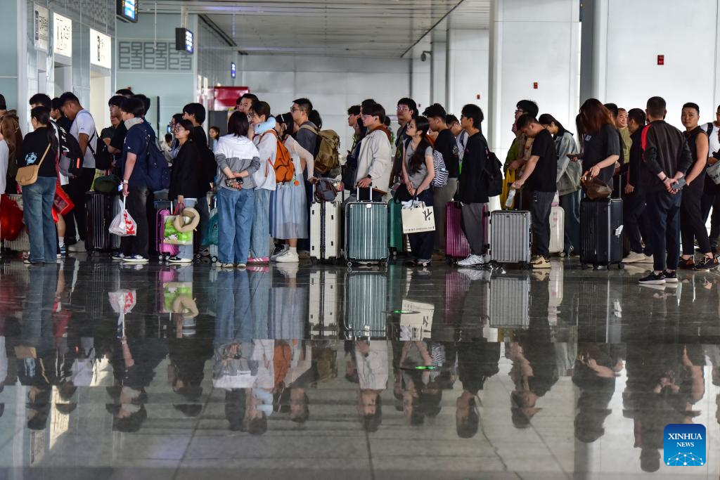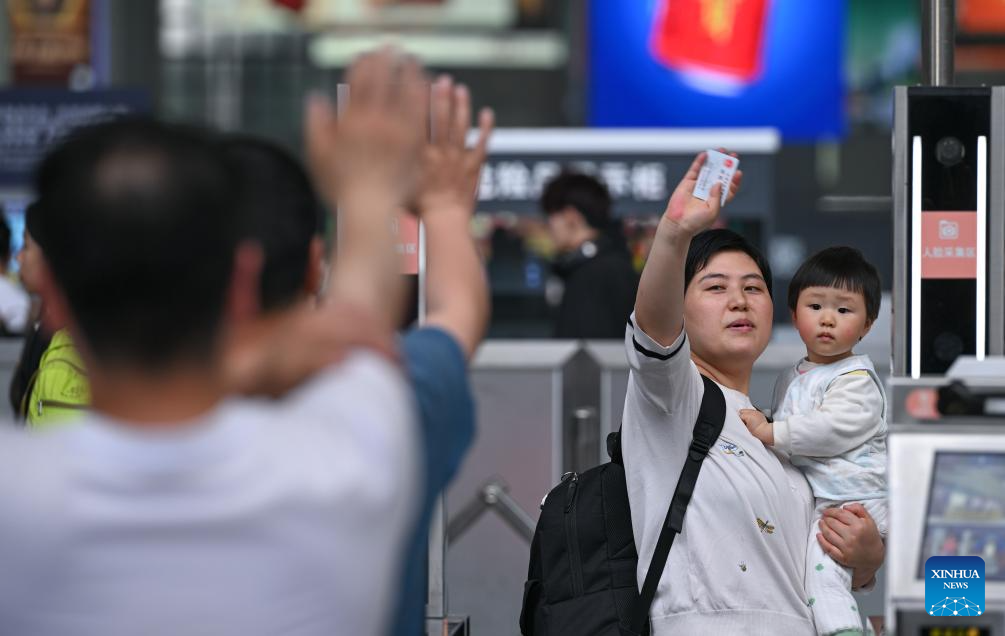 Passengers wave to their friends and family at Chongqing North Railway Station in Chongqing, southwest China, May 5, 2025. On the last day of the May Day holiday, a peak in return trips was observed nationwide. (Xinhua/Chen Cheng)