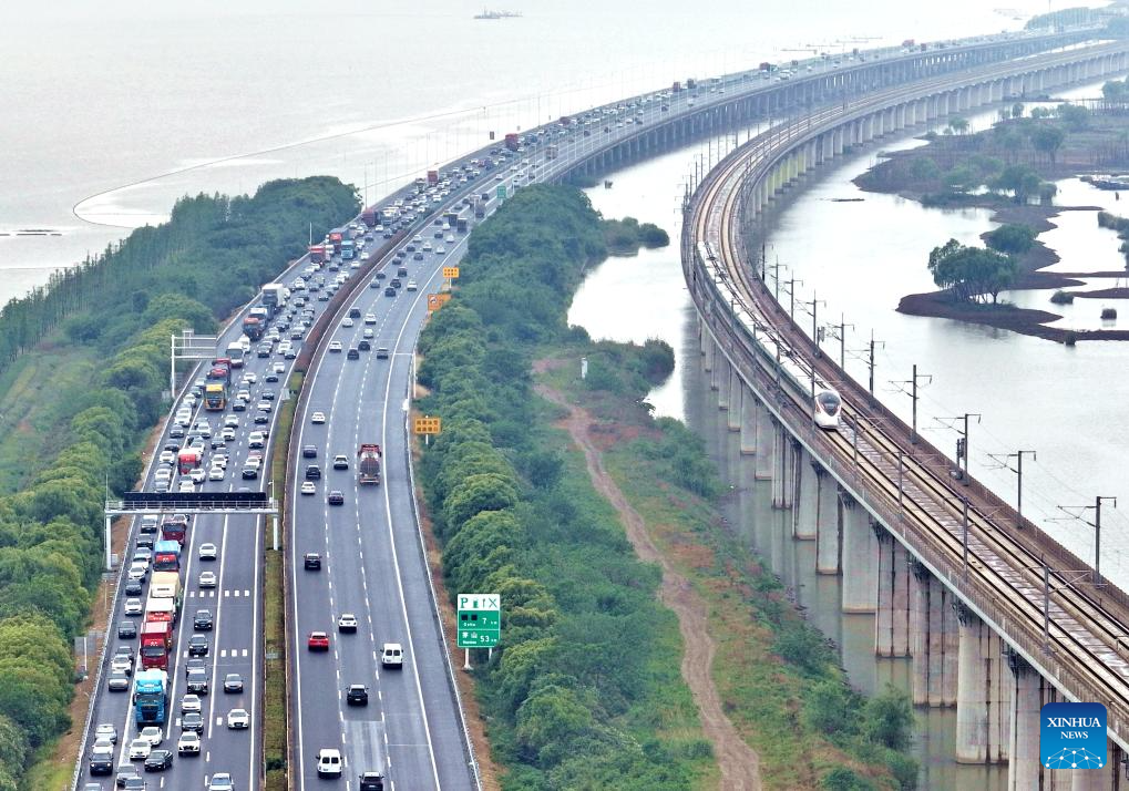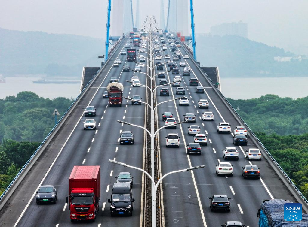 An aerial drone photo taken on May 5, 2025 shows traffic flows on Jiangyin grand bridge on Beijing-Shanghai expressway. On the last day of the May Day holiday, a peak in return trips was observed nationwide. (Photo by Gu Jihong/Xinhua)