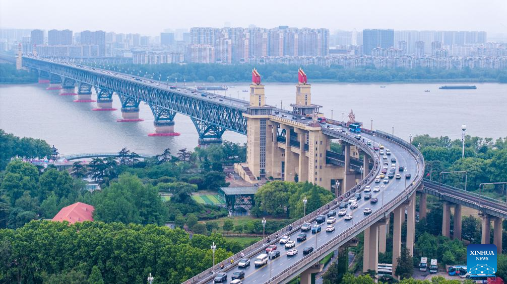 An aerial drone photo shows traffic flows on the Nanjing Yangtze River Bridge in Nanjing, east China's Jiangsu Province, May 5, 2025. On the last day of the May Day holiday, a peak in return trips was observed nationwide. (Photo by Yang Suping/Xinhua)