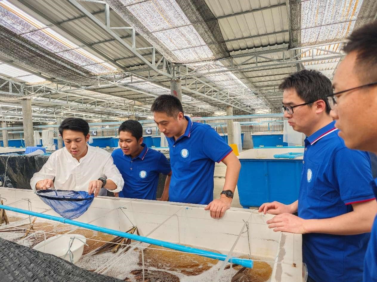 Researchers from Shanghai Ocean University assist local staff with seed cultivation at a hatchery for giant freshwater prawns in Kandal province, Cambodia. (Photo/Chen Leilei)
