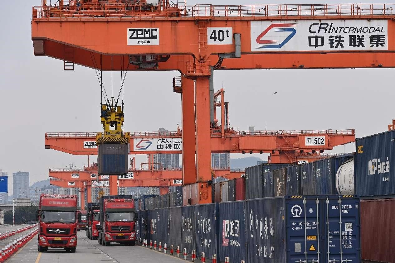 A crane lifts a container at a cargo station in Shapingba district, southwest China's Chongqing municipality. (People's Daily Online/Sun Kaifang)