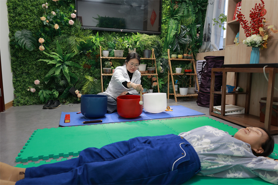 A medical worker provides singing bowl healing for a relative of a deceased patient at Gulou Hospital of Traditional Chinese Medicine in Beijing. (Li Yi/China Daily)