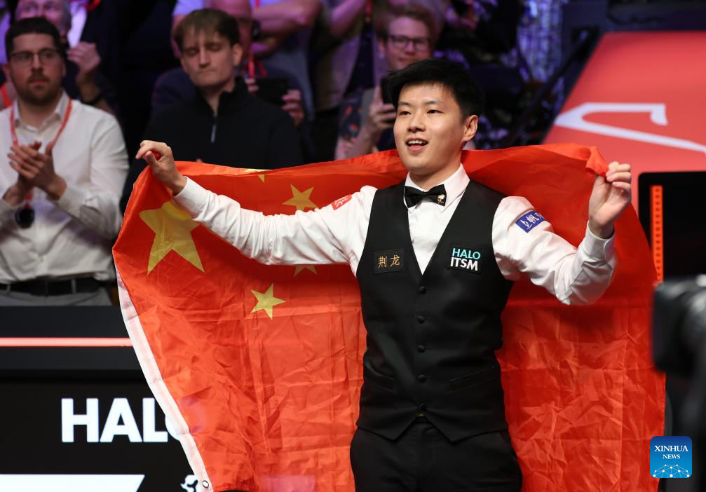 Zhao Xintong celebrates after winning the final between Zhao Xintong of China and Mark Williams of Wales at World Snooker Championship 2025 in Sheffield, Britain, May 5, 2025. (Photo by Zhai Zheng/Xinhua)