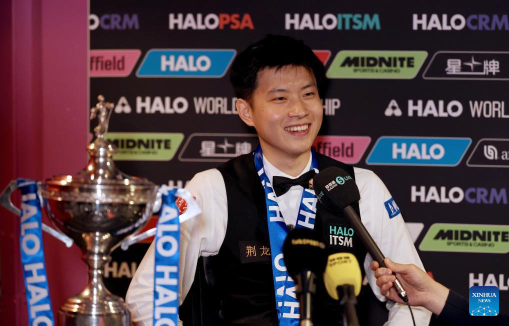 Zhao Xintong of China is interviewed with the trophy after claiming the title by defeating Mark Williams of Wales in the final at World Snooker Championship 2025 in Sheffield, Britain, May 5, 2025. (Photo by Zhai Zheng/Xinhua)