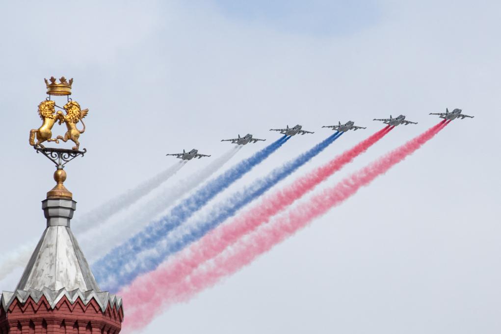 Su-25 attack aircrafts fly over Red Square during the Victory Day military parade, which marks the 79th anniversary of the Soviet victory in the Great Patriotic War, in Moscow, Russia, on May 9, 2024. (Xinhua/Bai Xueqi)