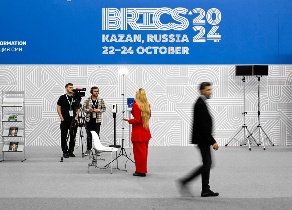 Media staff work at the press center of the 16th BRICS Summit in Kazan, Russia, Oct. 23, 2024. (Xinhua/Shen Hong)