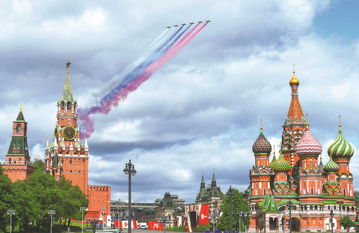 Aircraft fly in formation on Monday over Red Square in Moscow, Russia, during a rehearsal for the Victory Day military parade, which will mark the 80th anniversary of the Victory in the Great Patriotic War. (Photo/Xinhua)