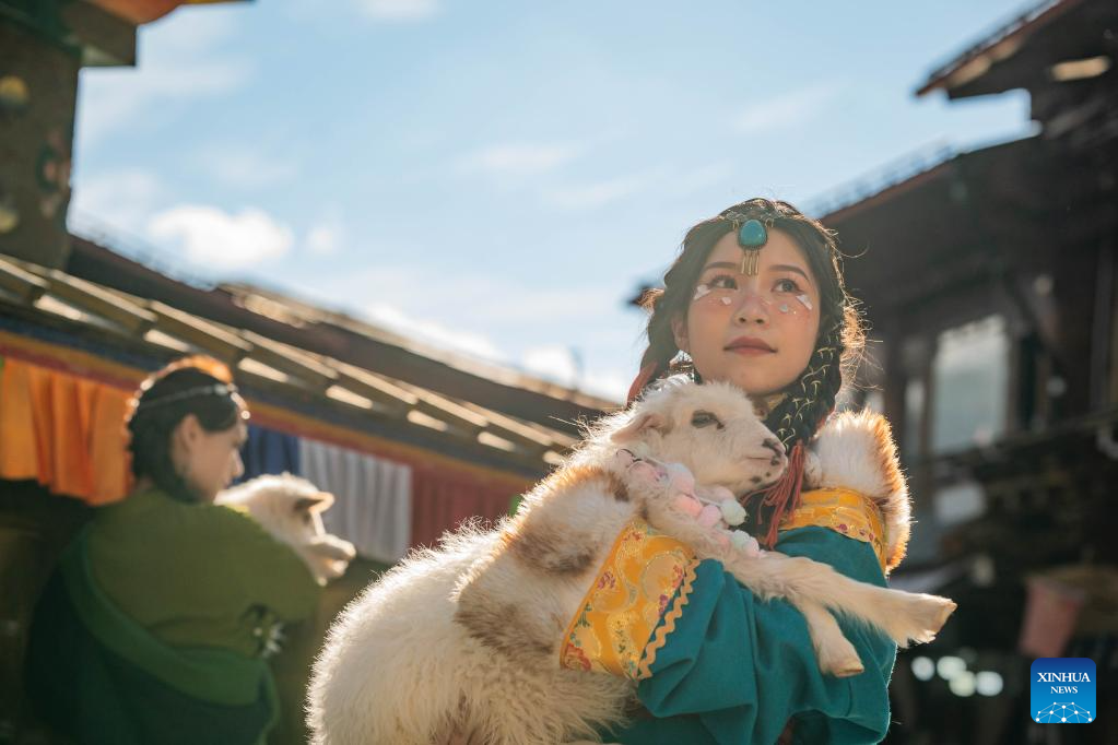 Tourists pose for photos with lambs in the ancient town of Dukezong in Shangri-la, the Deqen Tibetan Autonomous Prefecture, southwest China's Yunnan Province, March 8, 2023. Located in Deqen Tibetan Autonomous Prefecture of Yunnan Province, Shangri-La City sits at the intersection of Yunnan Province, Sichuan Province, and Xizang Autonomous Region. As a key hub along the ancient Tea Horse Road, this highland city, surrounded by snow-capped mountains, forests, and grasslands, is often regarded as a hidden paradise. (Xinhua/Hu Chao)