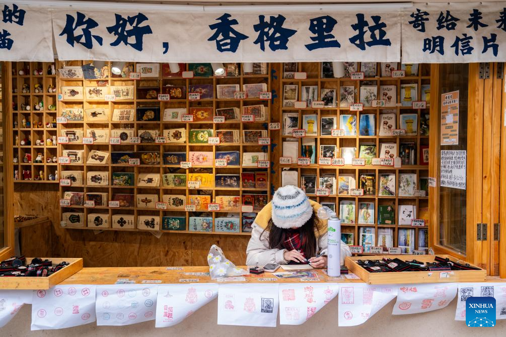 A tourist writes a postcard in the ancient town of Dukezong in Shangri-la, the Deqen Tibetan Autonomous Prefecture, southwest China's Yunnan Province, March 7, 2025. Located in Deqen Tibetan Autonomous Prefecture of Yunnan Province, Shangri-La City sits at the intersection of Yunnan Province, Sichuan Province, and Xizang Autonomous Region. As a key hub along the ancient Tea Horse Road, this highland city, surrounded by snow-capped mountains, forests, and grasslands, is often regarded as a hidden paradise. (Xinhua/Hu Chao)