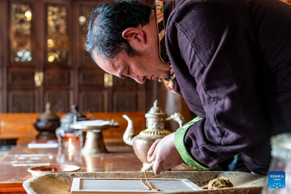 An intangible cultural heritage inheritor makes traditional incense in Shangri-la, the Deqen Tibetan Autonomous Prefecture, southwest China's Yunnan Province, March 6, 2025. Located in Deqen Tibetan Autonomous Prefecture of Yunnan Province, Shangri-La City sits at the intersection of Yunnan Province, Sichuan Province, and Xizang Autonomous Region. As a key hub along the ancient Tea Horse Road, this highland city, surrounded by snow-capped mountains, forests, and grasslands, is often regarded as a hidden paradise. (Xinhua/Hu Chao)
