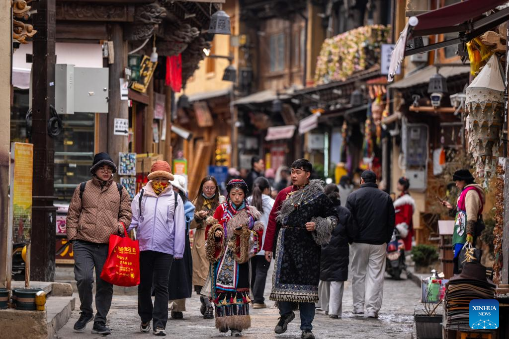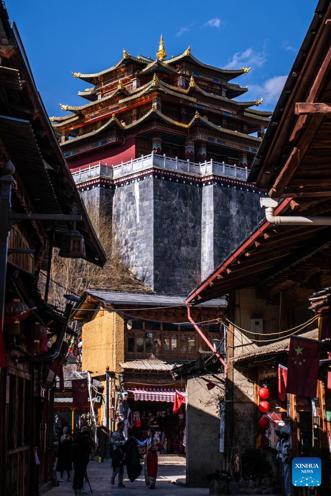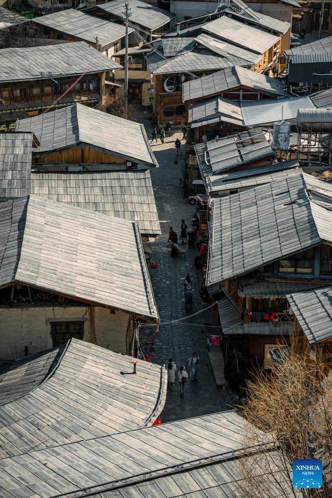 Tourists visit the ancient town of Dukezong in Shangri-la, the Deqen Tibetan Autonomous Prefecture, southwest China's Yunnan Province, March 7, 2025. Located in Deqen Tibetan Autonomous Prefecture of Yunnan Province, Shangri-La City sits at the intersection of Yunnan Province, Sichuan Province, and Xizang Autonomous Region. As a key hub along the ancient Tea Horse Road, this highland city, surrounded by snow-capped mountains, forests, and grasslands, is often regarded as a hidden paradise. (Xinhua/Hu Chao)