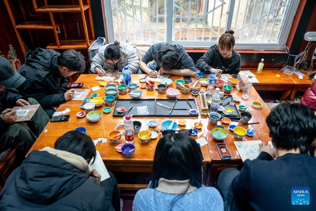 Tourists try to creat Thangkas at an intangible cultural heritage experience center in Shangri-la, the Deqen Tibetan Autonomous Prefecture, southwest China's Yunnan Province, March 6, 2025. Located in Deqen Tibetan Autonomous Prefecture of Yunnan Province, Shangri-La City sits at the intersection of Yunnan Province, Sichuan Province, and Xizang Autonomous Region. As a key hub along the ancient Tea Horse Road, this highland city, surrounded by snow-capped mountains, forests, and grasslands, is often regarded as a hidden paradise. (Xinhua/Hu Chao)