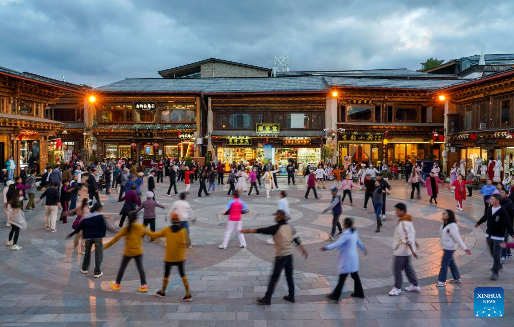 People dance in the ancient town of Dukezong in Shangri-la, the Deqen Tibetan Autonomous Prefecture, southwest China's Yunnan Province, Sept. 27, 2024. Located in Deqen Tibetan Autonomous Prefecture of Yunnan Province, Shangri-La City sits at the intersection of Yunnan Province, Sichuan Province, and Xizang Autonomous Region. As a key hub along the ancient Tea Horse Road, this highland city, surrounded by snow-capped mountains, forests, and grasslands, is often regarded as a hidden paradise. (Xinhua/Wang Jingyi)