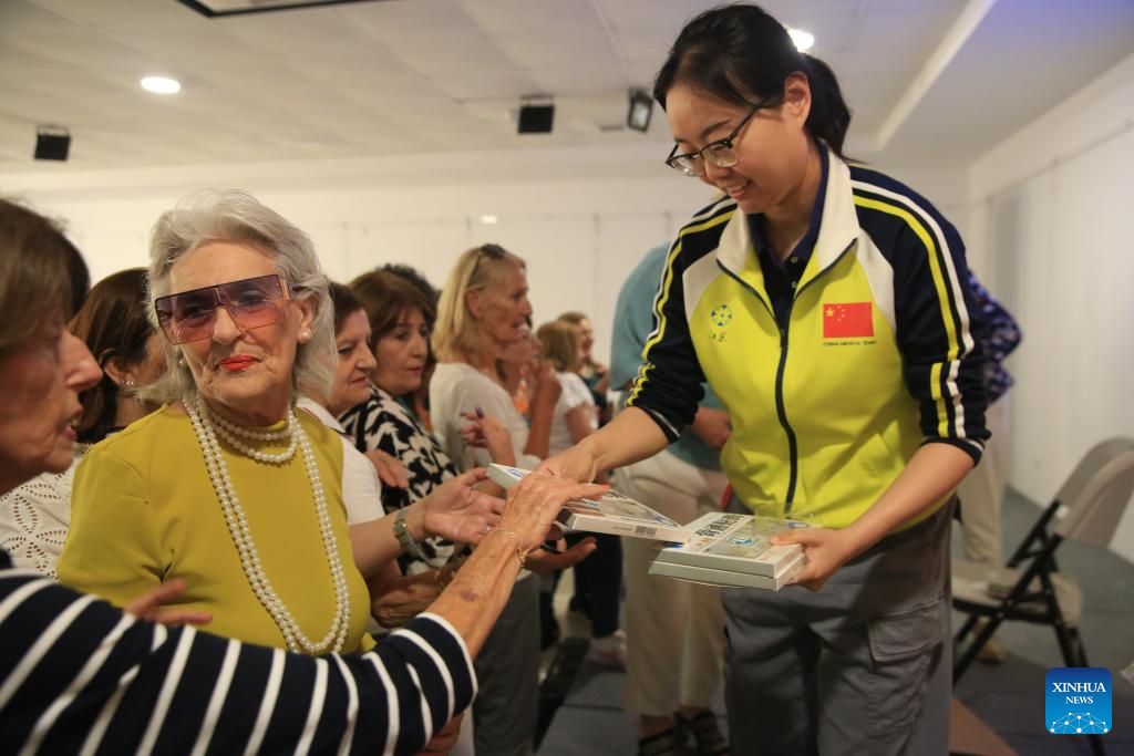 Zhou Wenting (1st R), a member of the 20th Chinese medical team for Malta, distributes medicinal plasters in Swieqi, Malta, on May 6, 2025. The 20th Chinese medical team from the Mediterranean Regional Centre for Traditional Chinese Medicine (MRCTCM) provided free clinical services to residents at the Swieqi Local Council in eastern Malta on Tuesday. (Xinhua/Chen Wenxian)