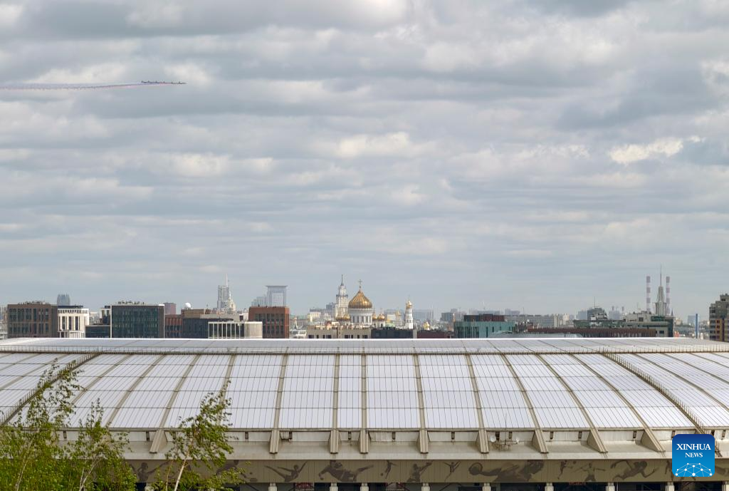 Aircraft fly in formation over the city during a rehearsal for the Victory Day military parade, which marks the 80th anniversary of the Victory in the Great Patriotic War, in Moscow, Russia, May 5, 2025. (Xinhua/Bai Xueqi)