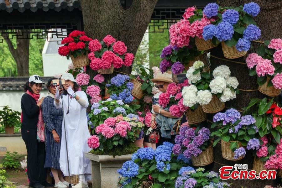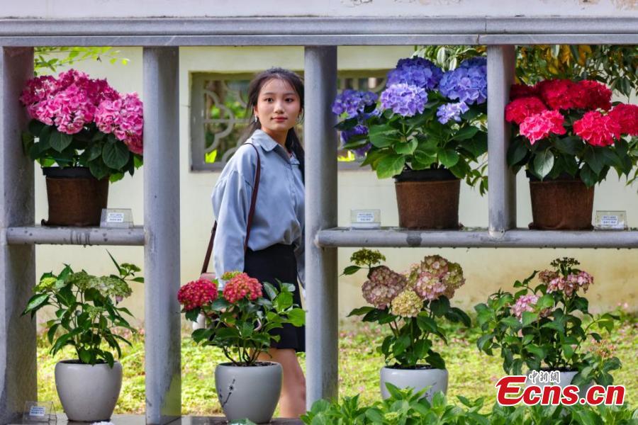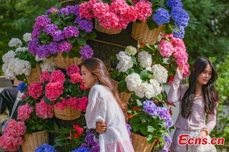 Visitors pose for photos amid blooming hydrangea flowers at Nanjing Botanical Garden Mem. Sun Yat-Sen in east China's Jiangsu Province, May 6, 2025. (China News Network/Yang Bo)