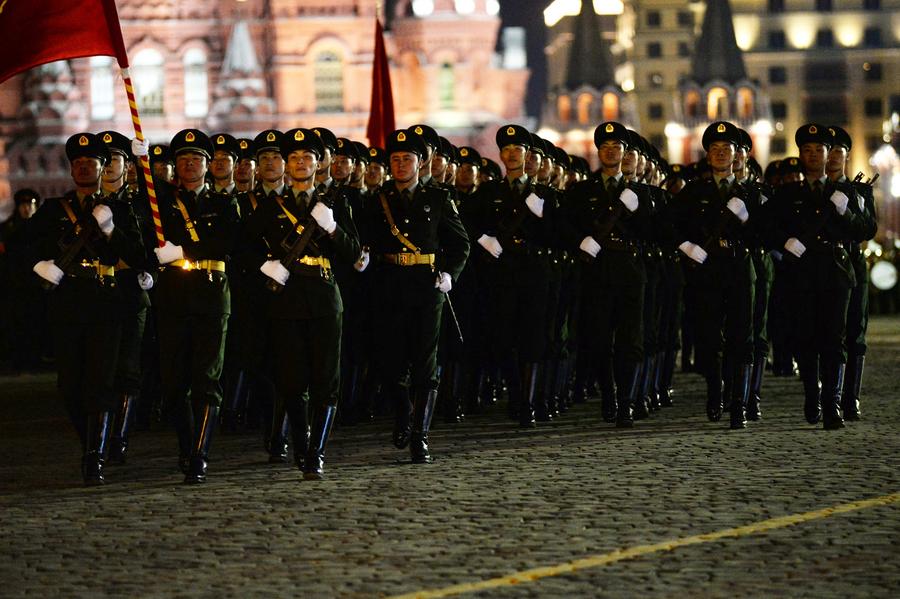 China's guards of honor take part in the rehearsal of the Victory Day parade in Moscow, Russia, April 29, 2015. (Xinhua/Pavel Bednyakov)