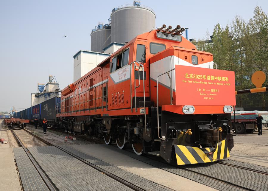 A China-Europe freight train bound for Moscow of Russia waits for departure at a logistics center in Beijing, capital of China, April 16, 2025. (Xinhua/Zhang Chenlin)