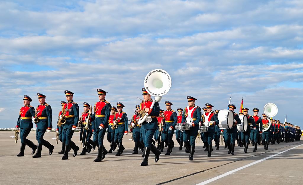 Members of a military band are pictured at the airport in Moscow, Russia, May 7, 2025. Chinese President Xi Jinping arrived here on Wednesday to pay a state visit to Russia and attend the celebrations marking the 80th anniversary of the Victory in the Soviet Union's Great Patriotic War. (Xinhua/Ding Haitao)