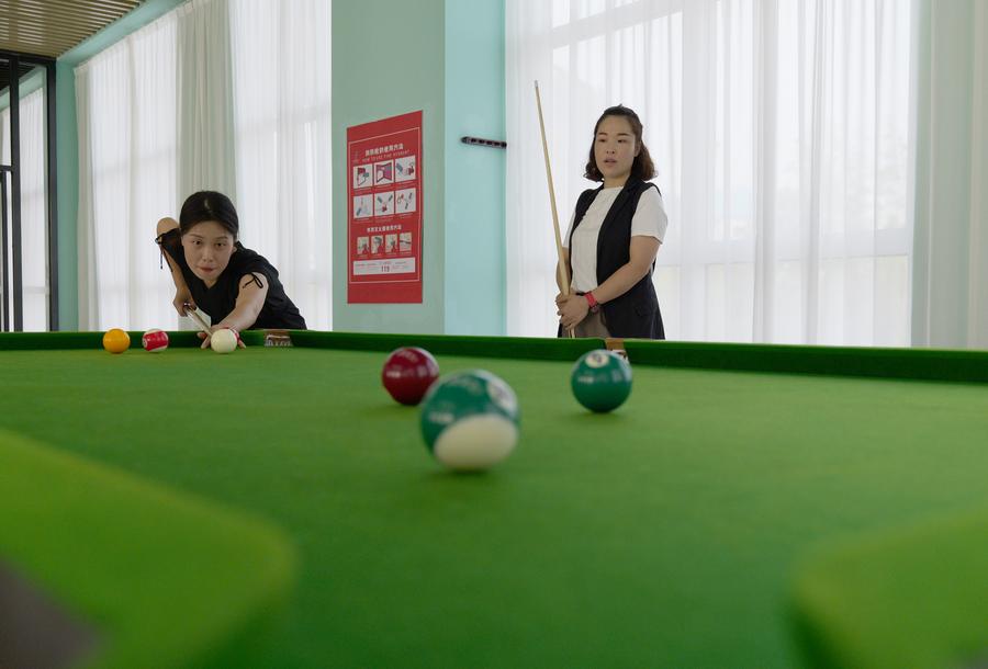 Two enthusiasts play billiards at an indoor fitness center in Lixue Community Sports Park, Luoyang, China's Henan Province, Aug. 17, 2023. (Xinhua/Li Jianan)