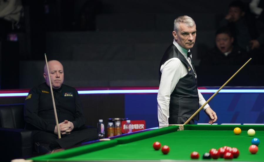John Higgins (L) looks on as Mark Davis prepares to take a shot during their second round contest at the Snooker World Open in Yushan, east China's Jiangxi Province, Feb. 23, 2025. (Xinhua/Zhou Mi)