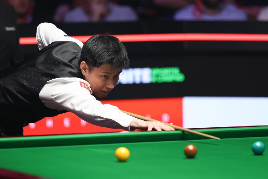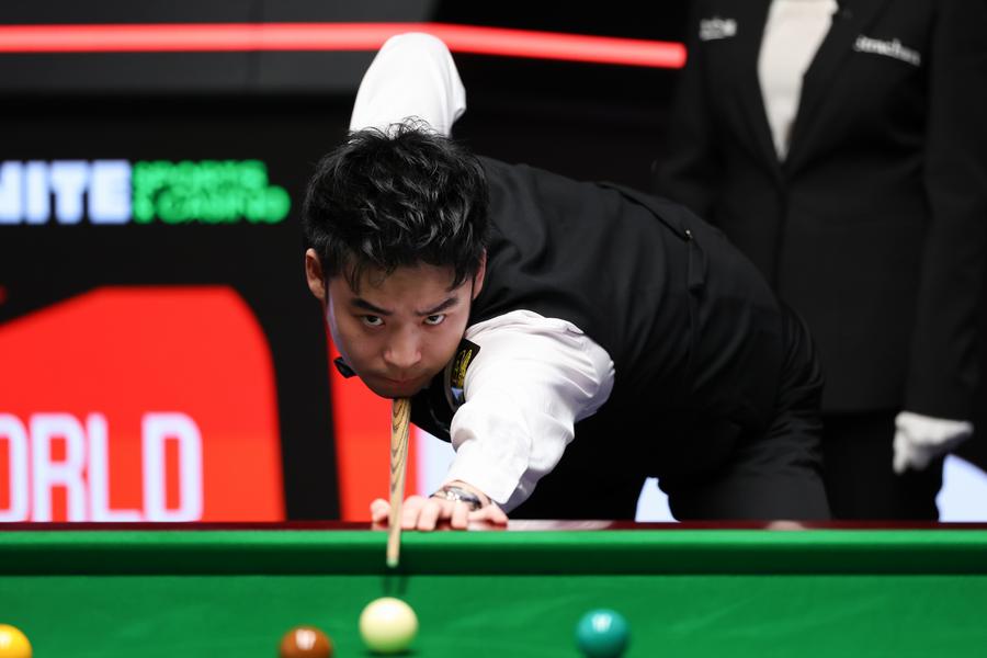 Si Jiahui in action against David Gilbert in the first round of the 2025 World Snooker Championship, April 22, 2025. (Photo by Zhai Zheng/Xinhua)