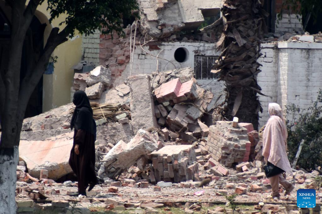 Women walk through rubble of a destroyed building after an Indian missile attack in Muridke, a town near Lahore, Pakistan on May 7, 2025. Twenty-six people, including women and children, were killed and 46 others injured when India attacked civilian settlements in six areas of Pakistan on Tuesday night and Wednesday morning, a spokesperson for the Pakistani army's media wing said. (Photo by Sajjad/Xinhua)